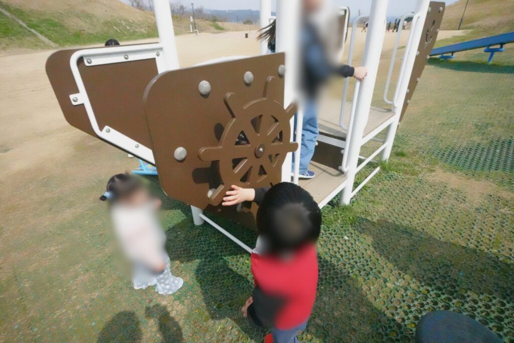 船型の遊具には、舵を回せるしかけがあったり、お魚のモチーフがあったりして、「見る」だけでも楽しい工夫があります。
