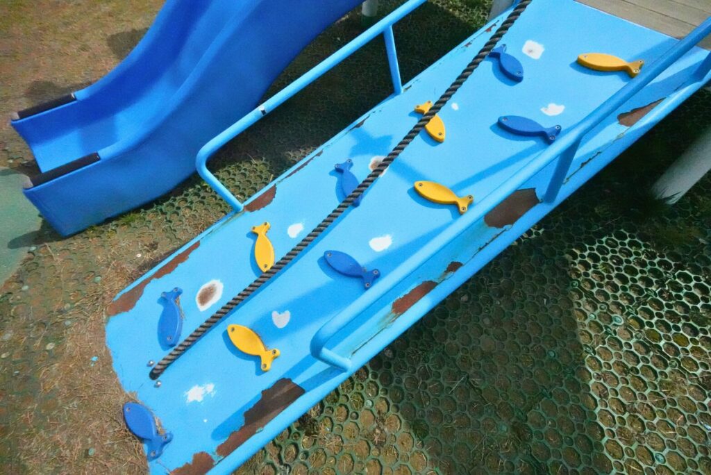 長い滑り台がついた大きな遊具があり、小学生くらいの子が夢中になりそうなつくりです。でも、それだけではなく、小さな子でも遊びやすい遊具もちゃんとありました。