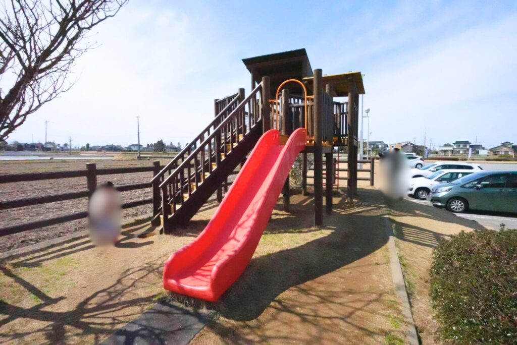 私も一緒に上がって、滑り台を滑りました。少し照れたような、でも安心したような表情で、その空気がなんだかかわいくてほっこりします。
